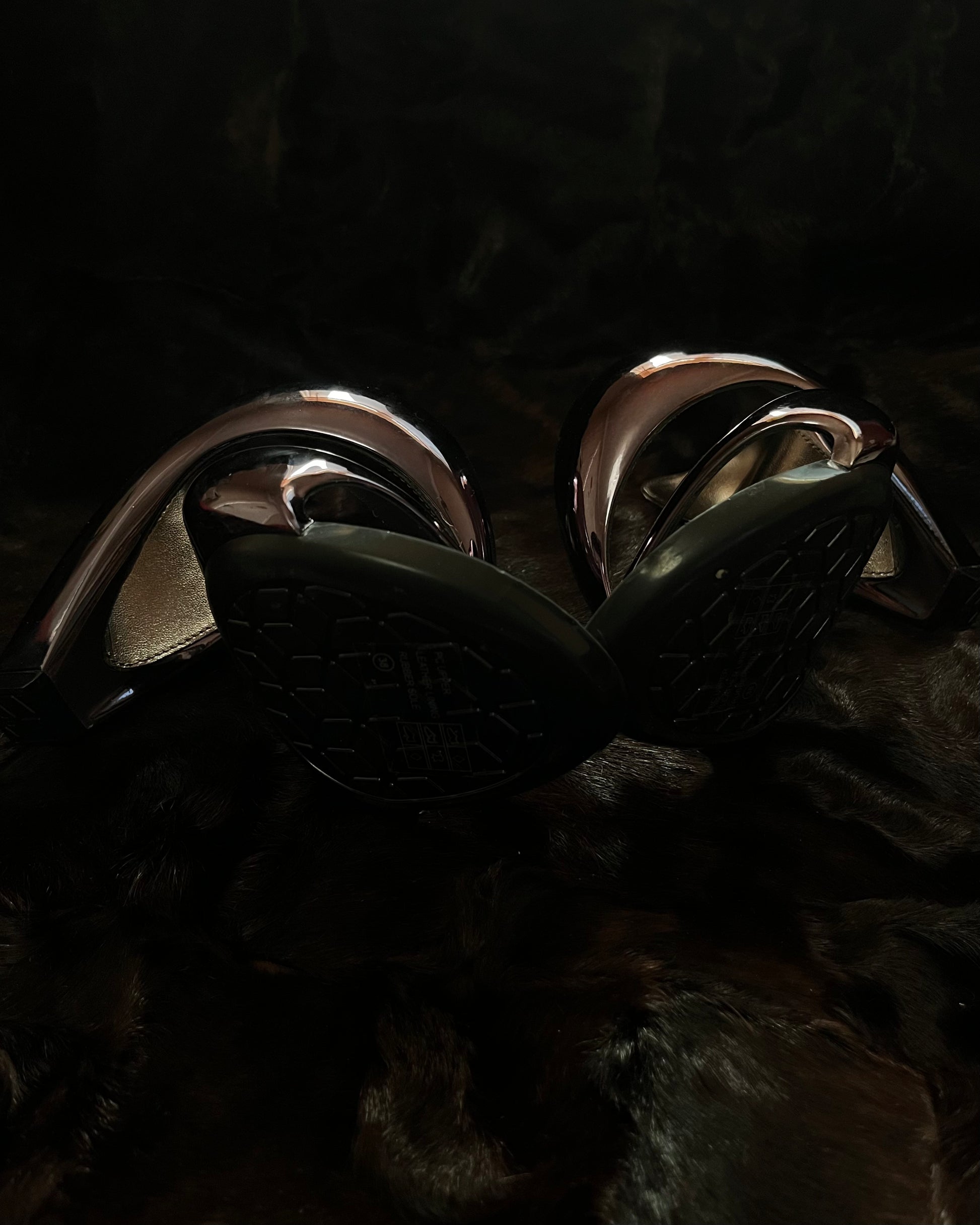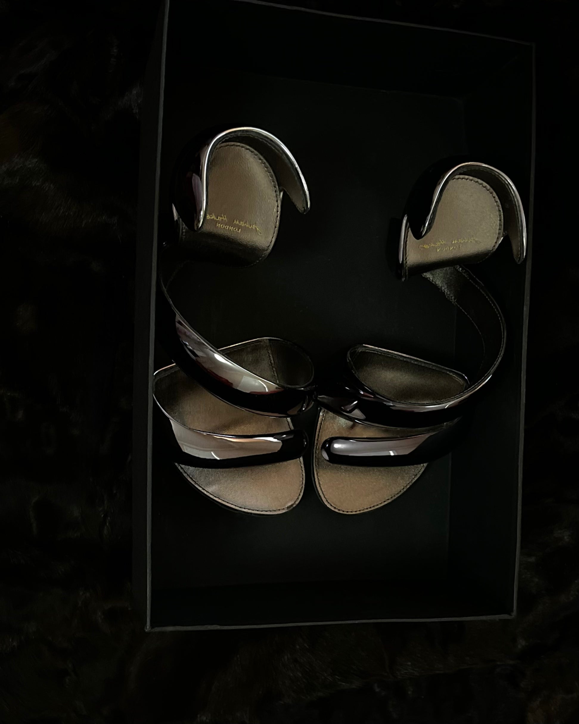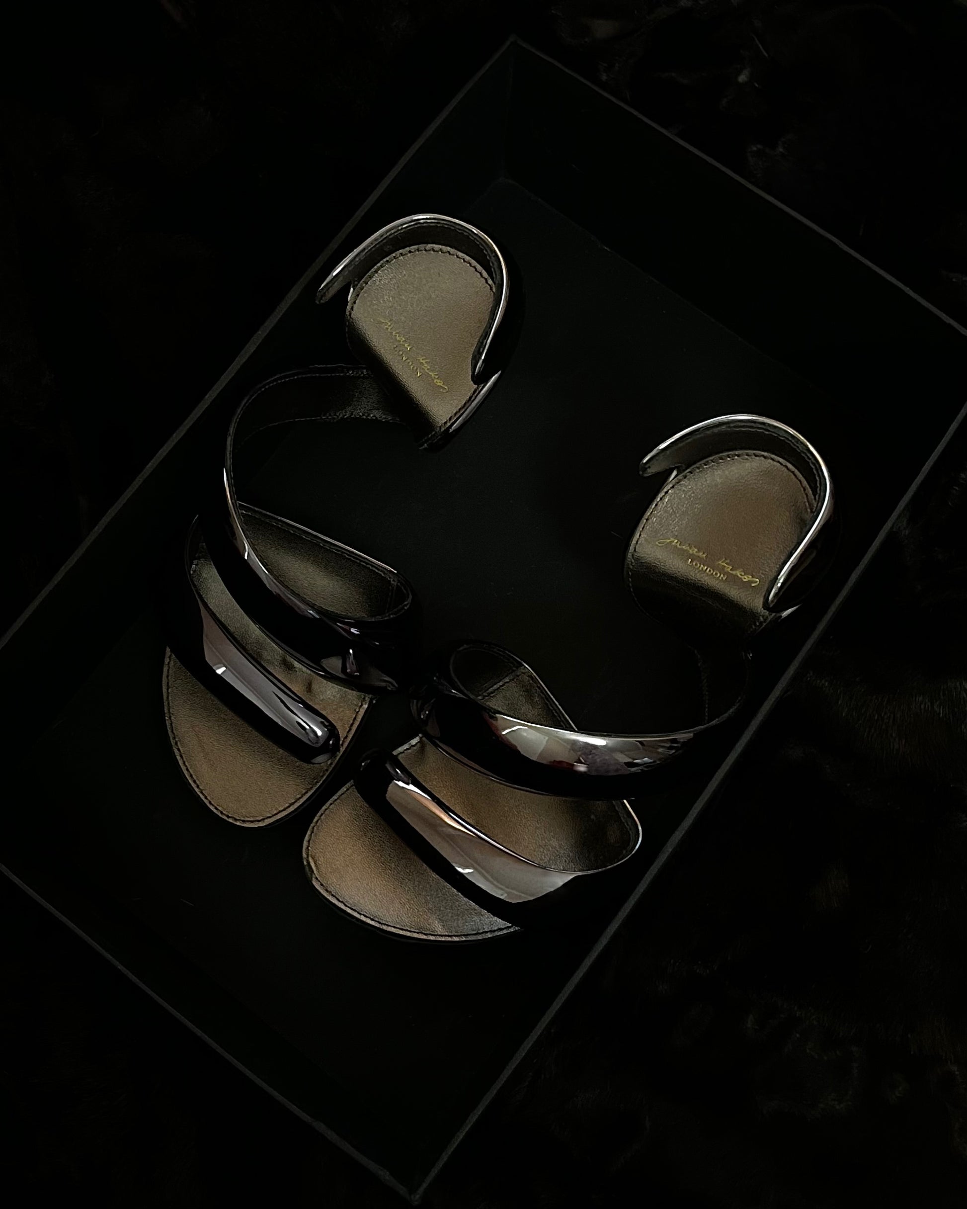 Description: Metallic resin sculpted Julian Hakes Mojito sandals with cut out accents.