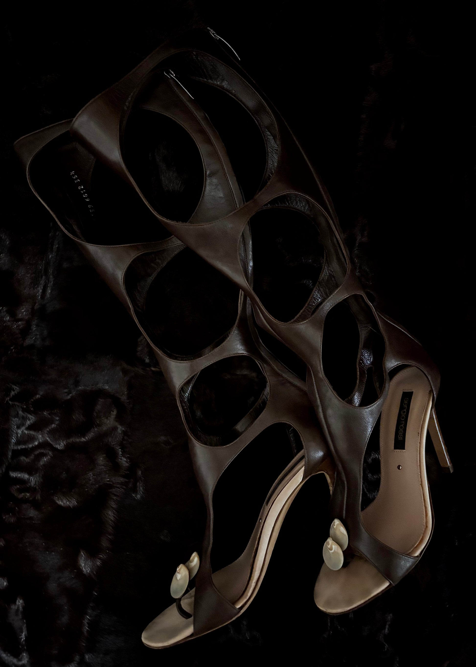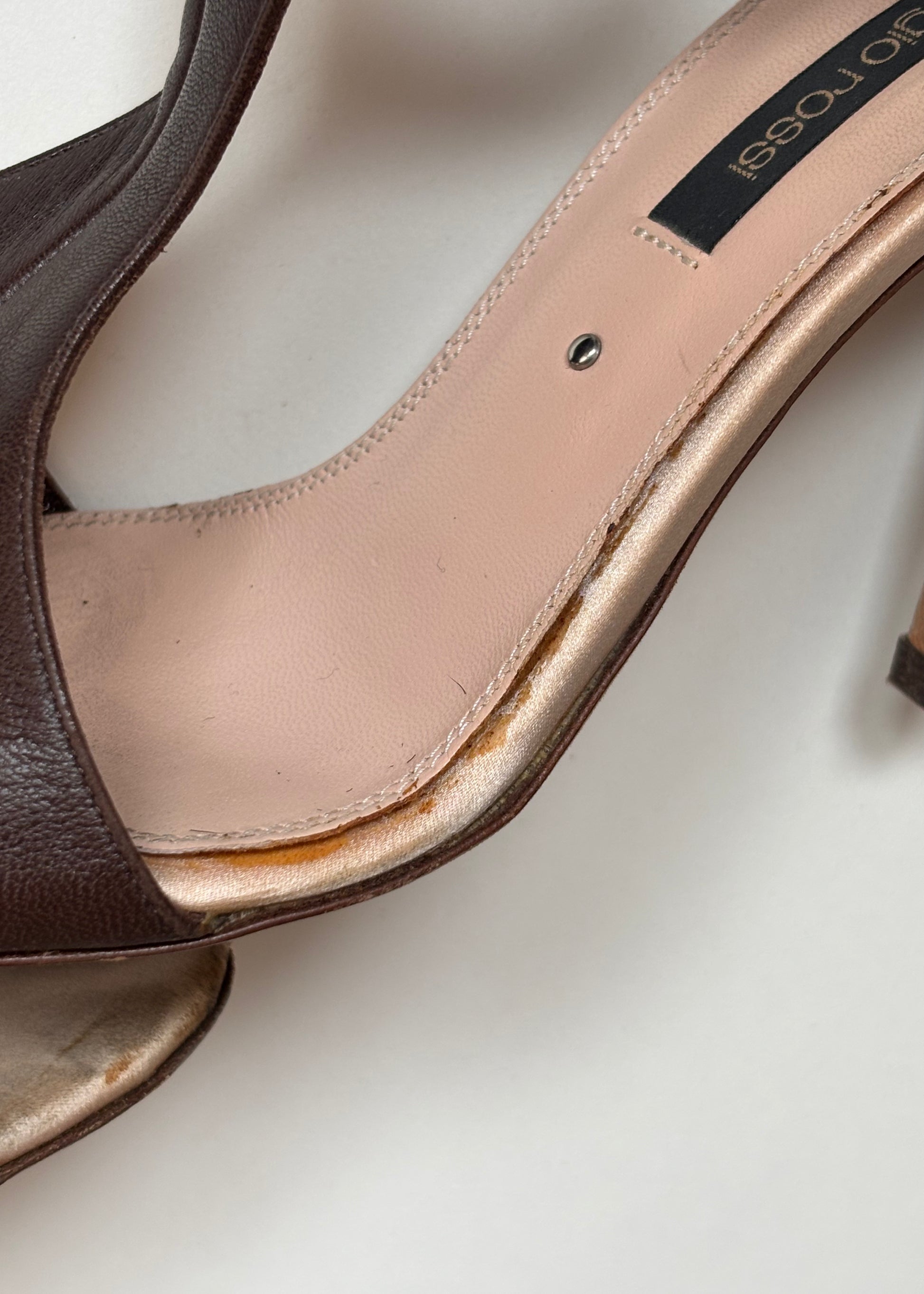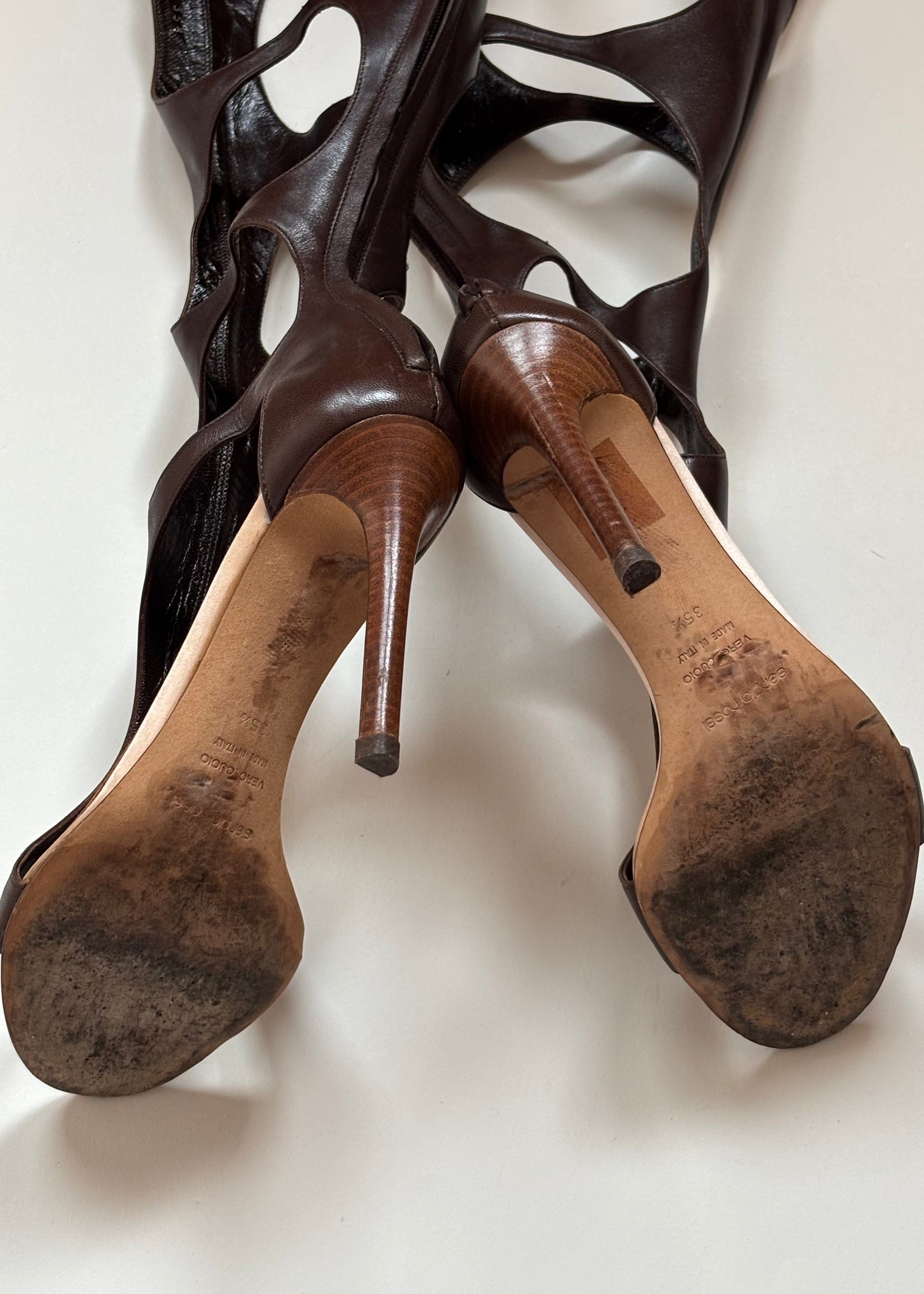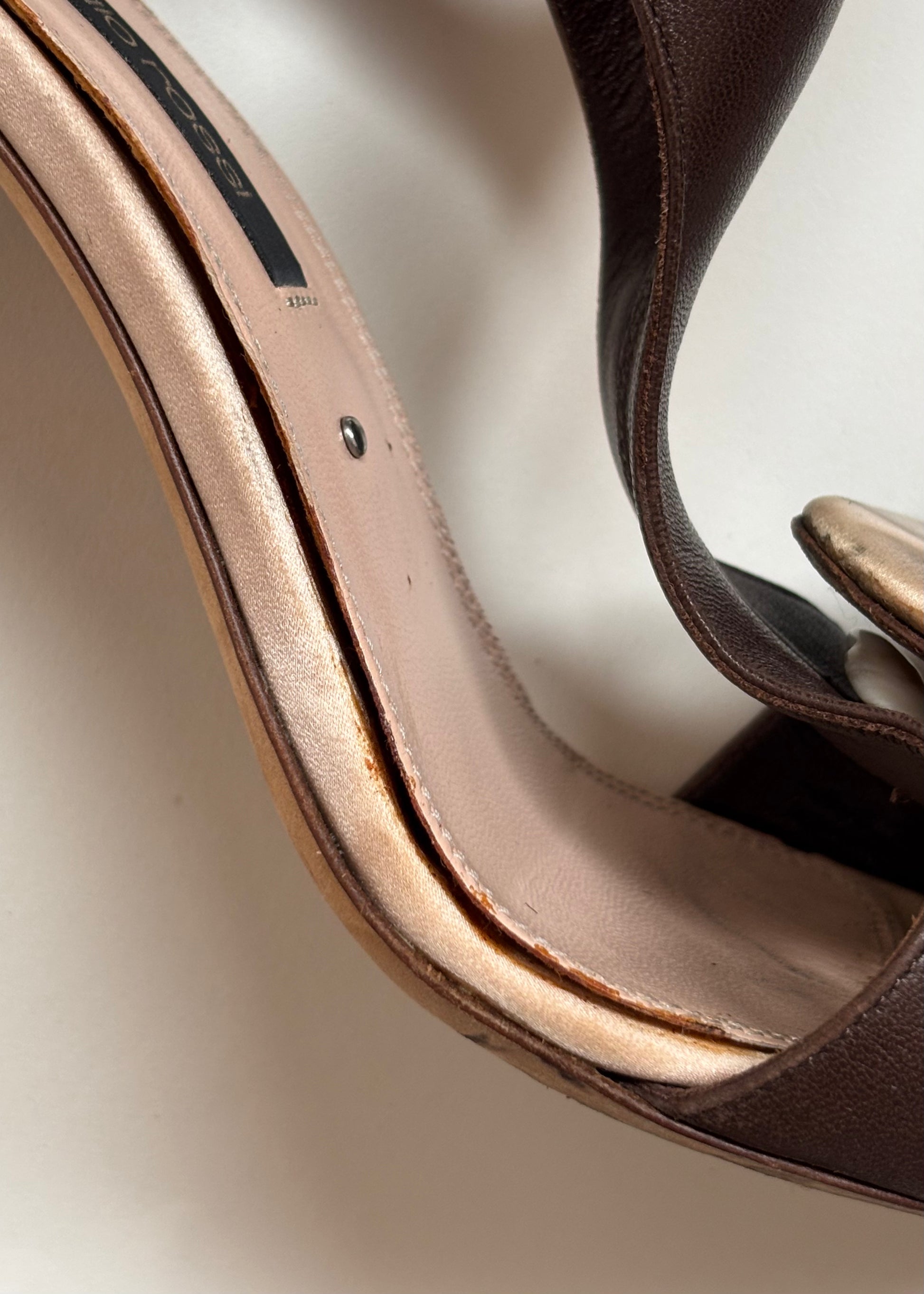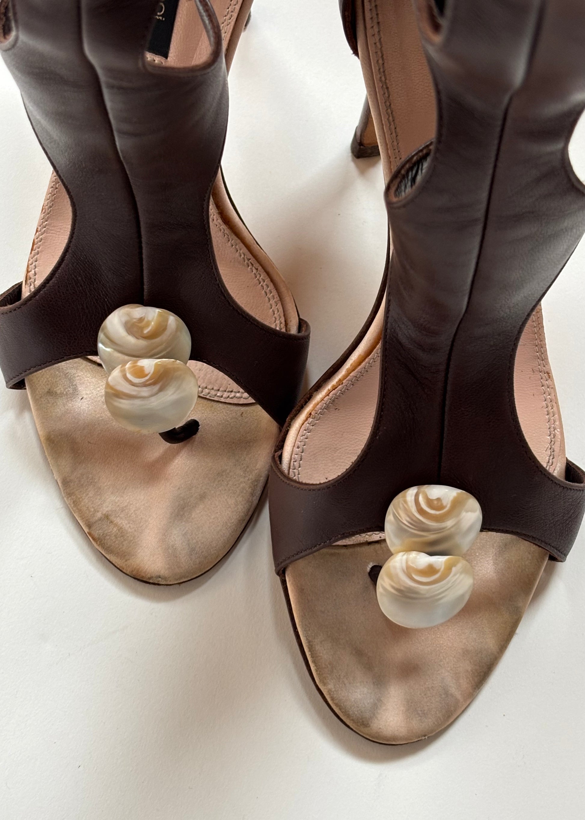 Description: Very rare Sergio Rossi Heels, brown leather gladiator style heels with cut-out detailing. Features a high stiletto heel, shell detailing, open toe, and zip closure at the back.